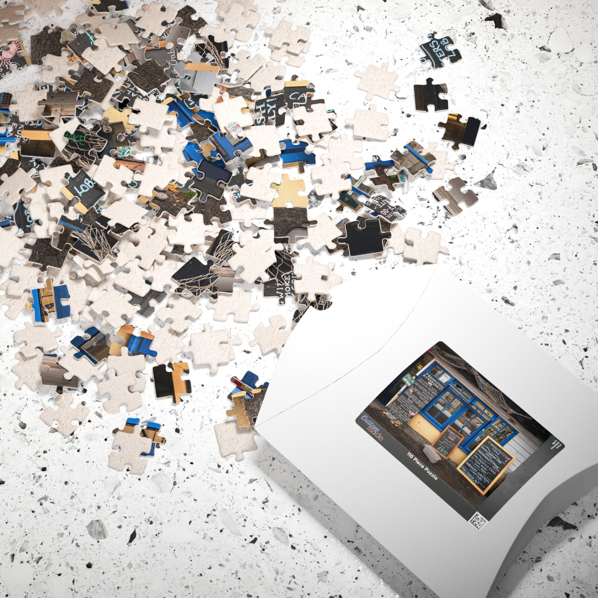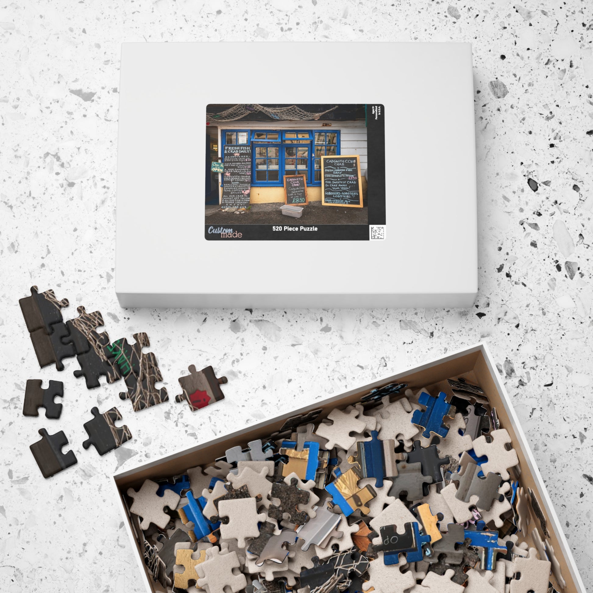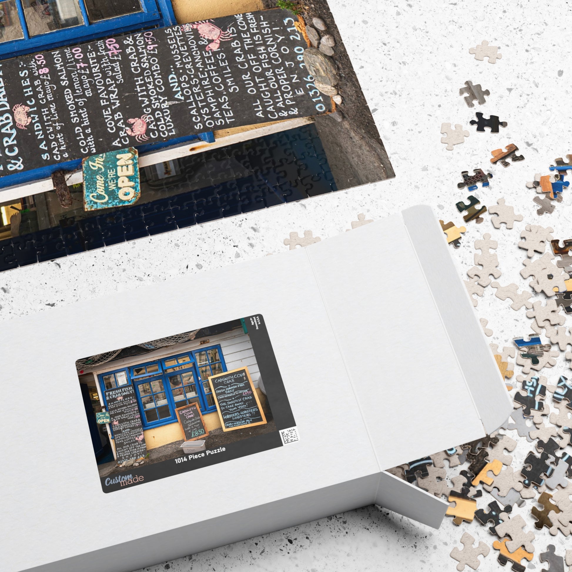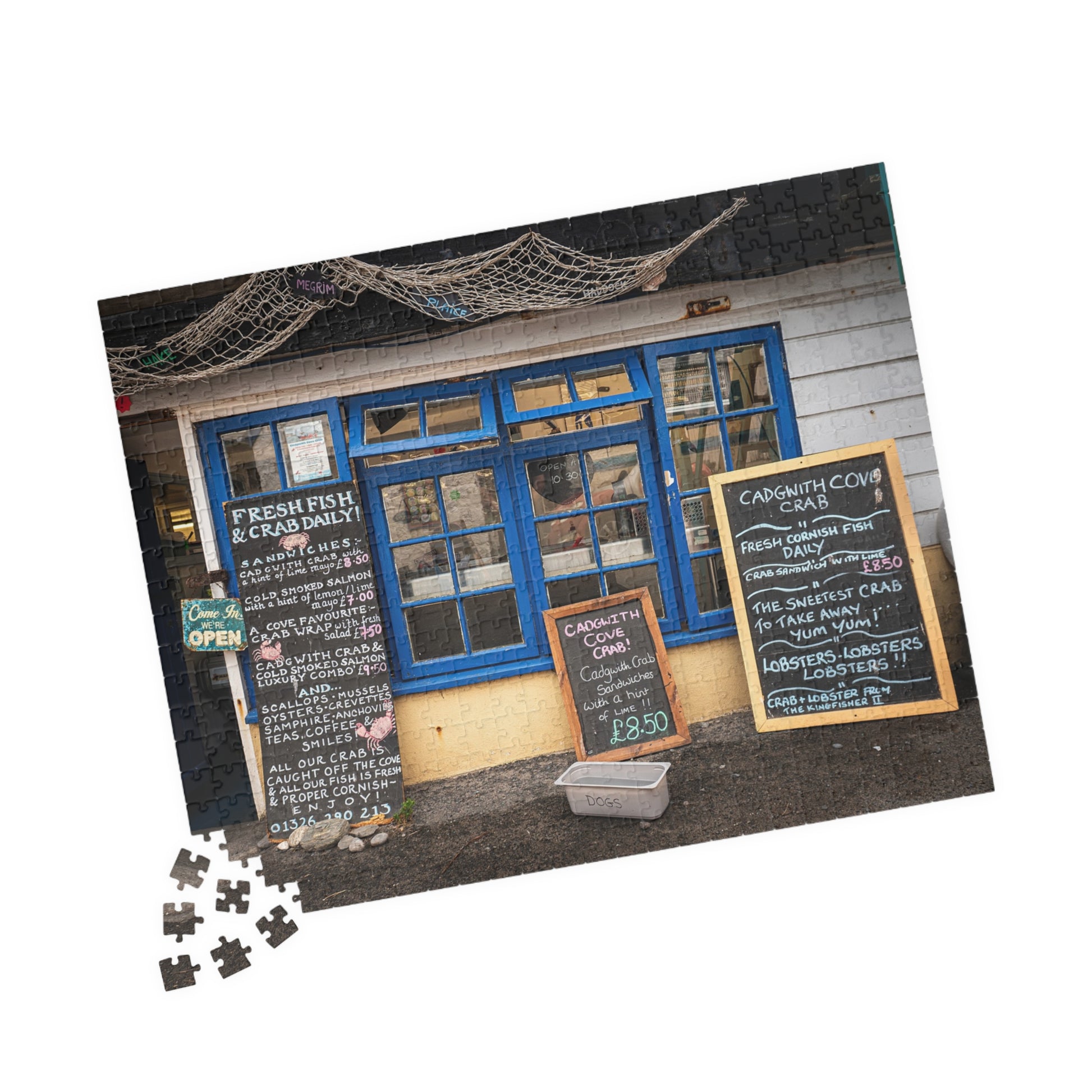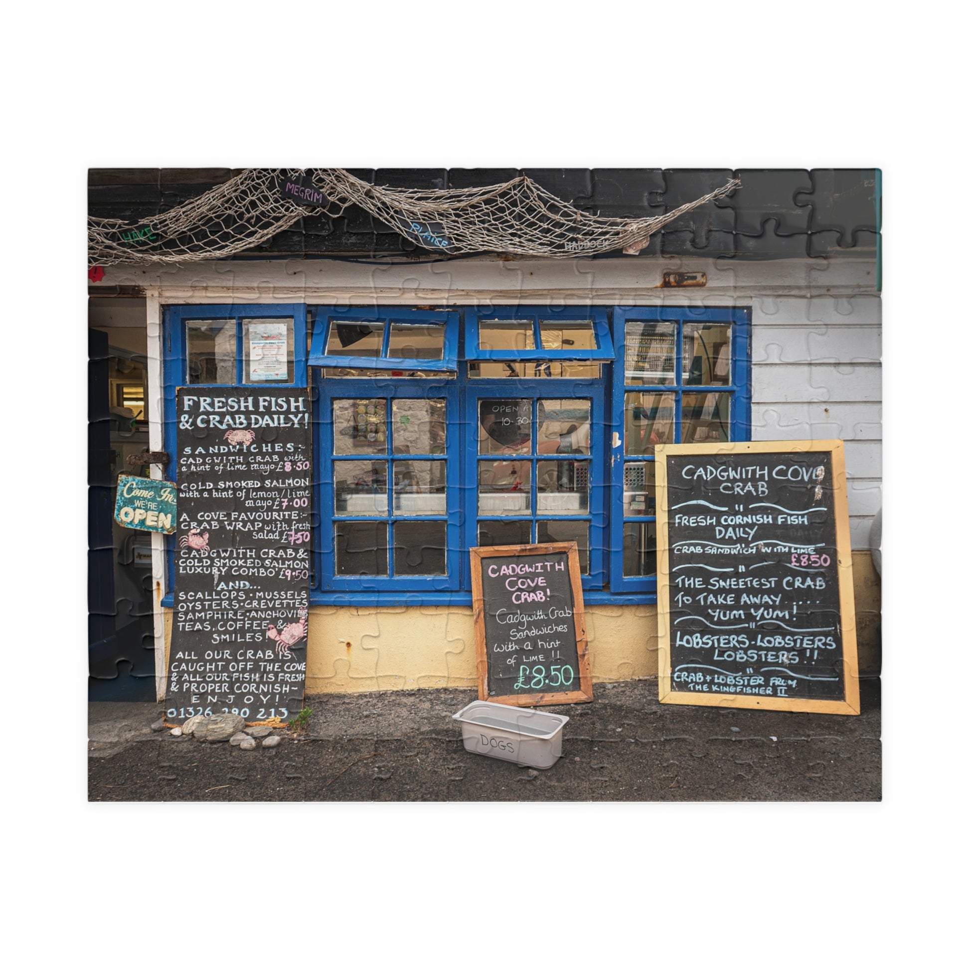Cadgwith Cornwall UK Fish Shop Jigsaw Puzzle - Coastal Chalkboard Menu Scene (110–1014 pcs)