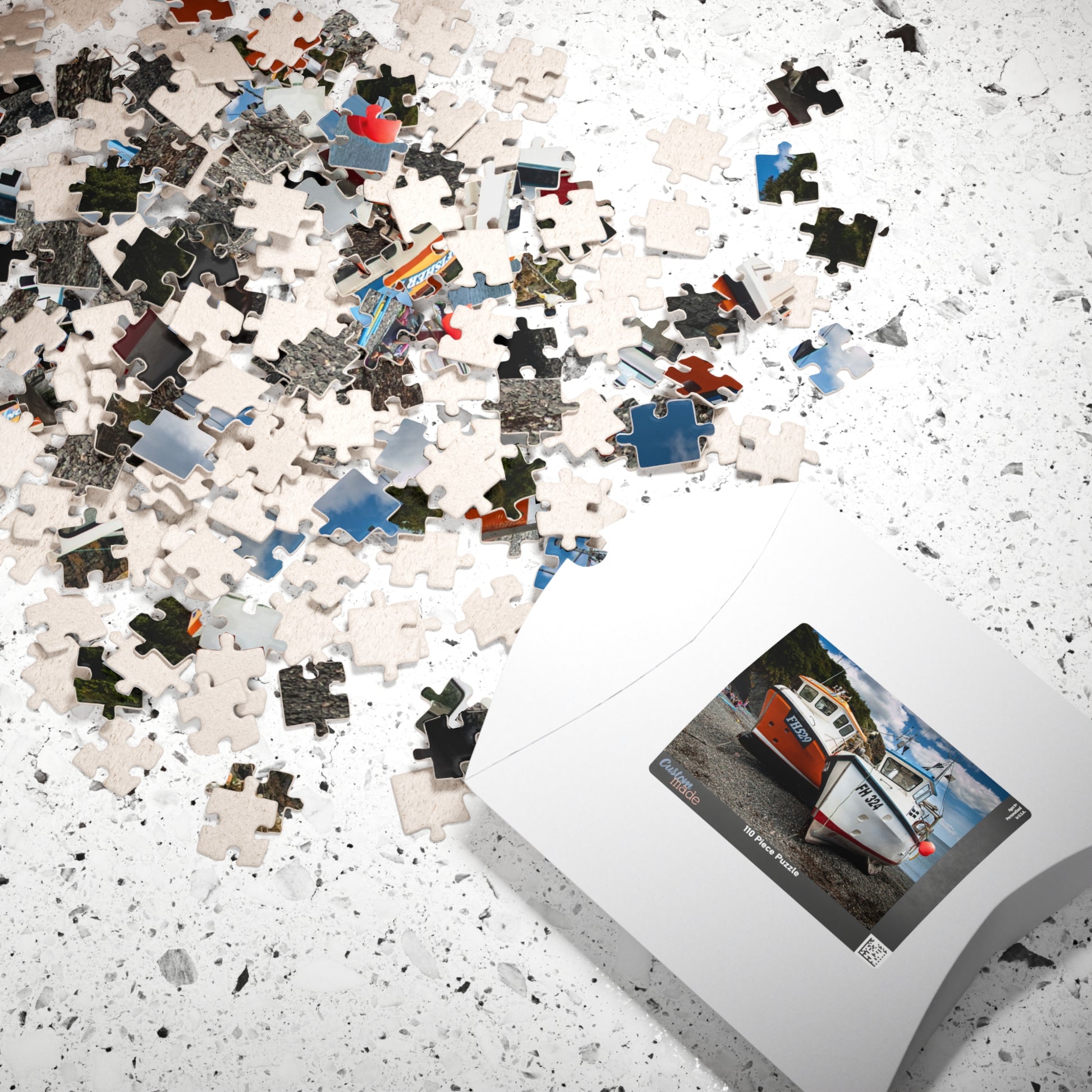 Lay out a peaceful seaside afternoon, piece by piece. This vibrant chipboard puzzle captures two weathered fishing boats hauled onto a pebbled cove beneath a sky of rolling clouds. The glossy, full-color print brings the boats’ chipped paint, the warm buoy, and the distant cliffs to life — a tactile way to slow down, sip tea, and remember salty air. Choose your challenge level (110, 252, 520, or 1014 pieces) and orientation, then assemble this little coastal scene at your kitchen table or keep it as a framed memory when finished. The puzzle arrives in a matching paper box with the artwork on the lid, so it looks as good stored as it does on the table.