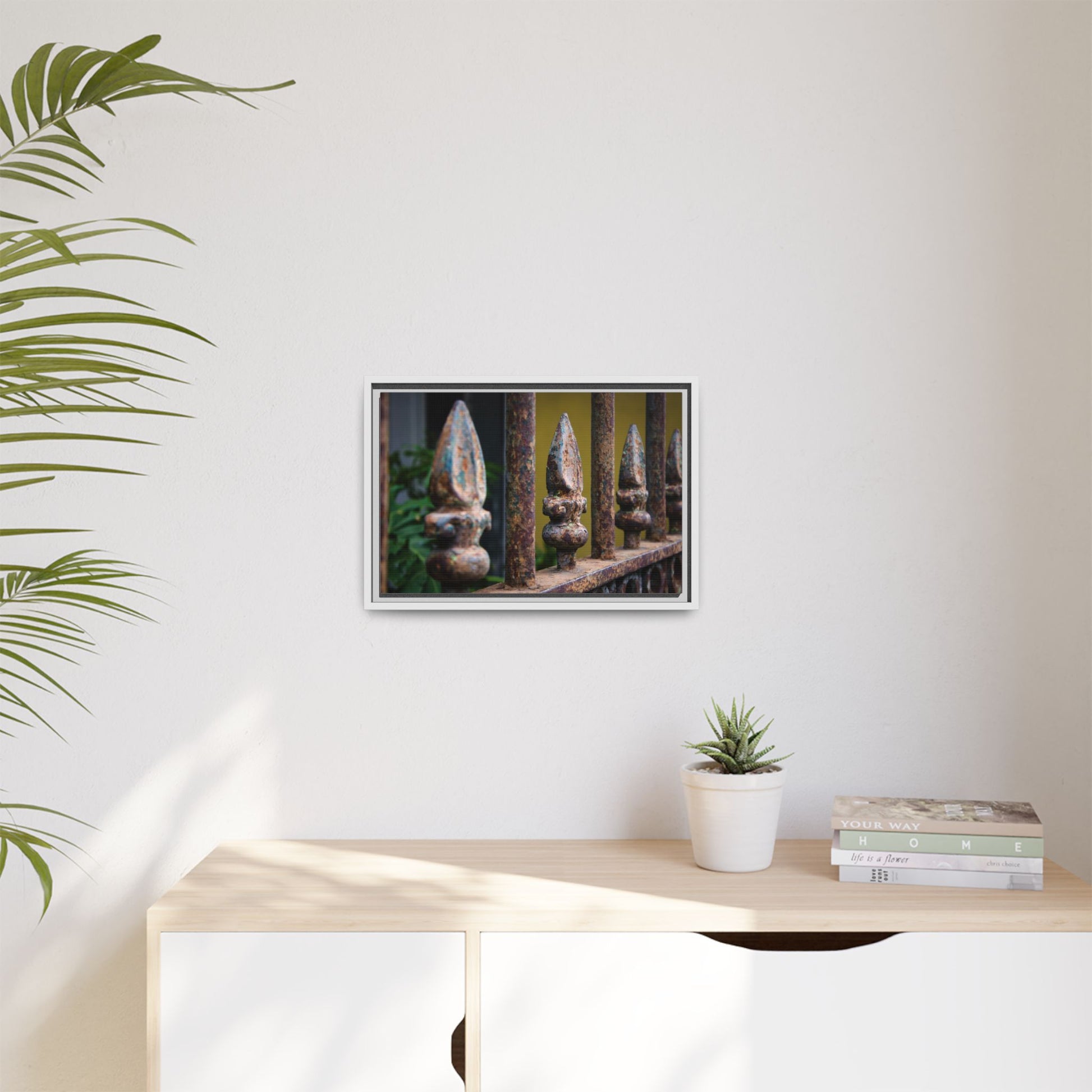 Printed with archival materials and stretched over a sustainable pine frame, the piece keeps its muted, multi-color palette true to the original mood. The matte finish softens glare and highlights texture, so the ironwork feels tactile and lived-in—like something passed down from an old neighborhood porch. This is for people who notice patina, who curate spaces with character, and who want a quiet, storied accent that ages beautifully alongside them.