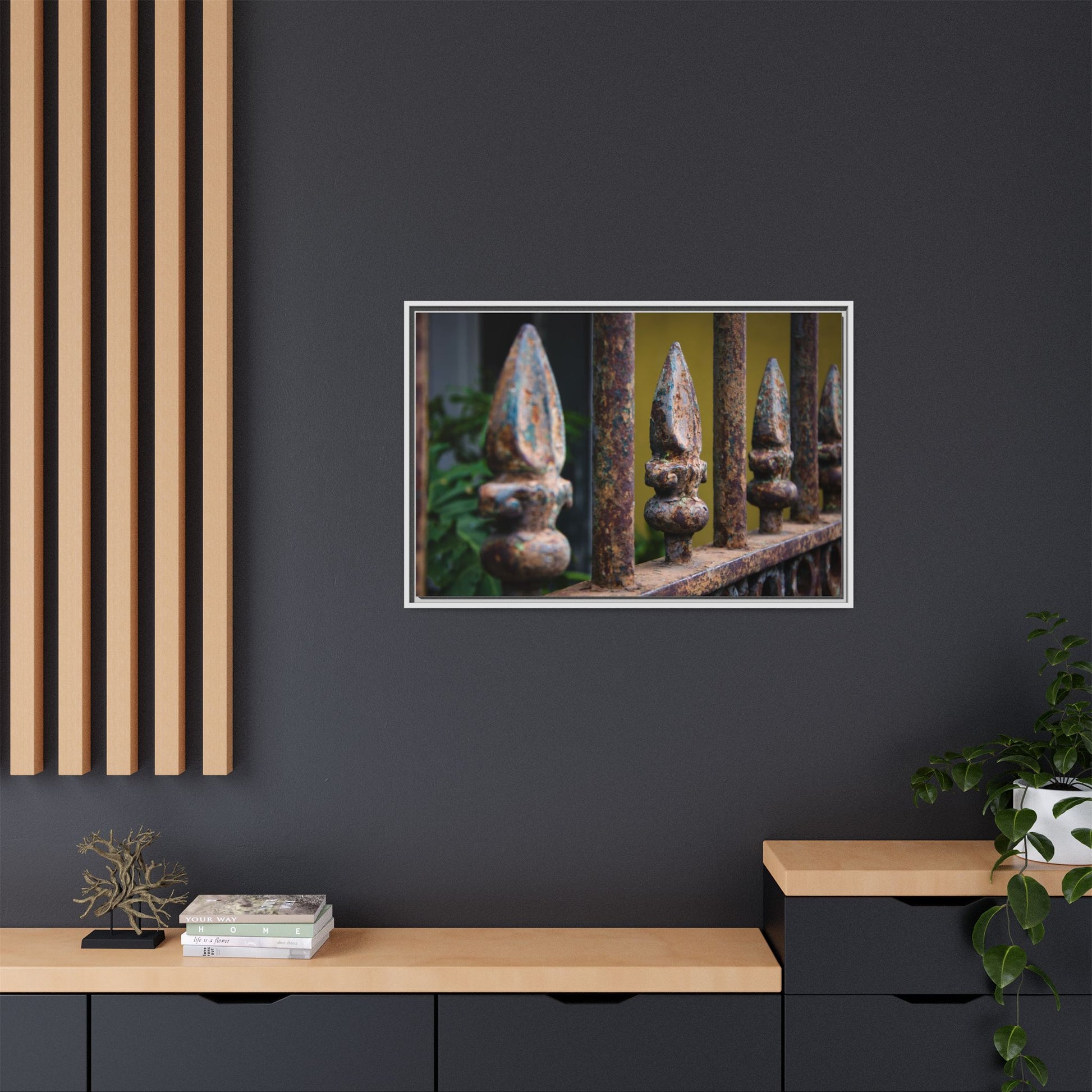 Weathered iron finials and twisting wrought iron come alive on museum-grade matte canvas. This framed print channels the sultry, timeworn streets of New Orleans—rust flecked against moonlit brick, the kind of detail you find leaning over a balcony at midnight. Hang it where late-night conversations linger and the room drinks in a little Southern grit and history. It settles into kitchens, entryways, or study walls that collect stories, inviting the eye to trace ironwork and imagine brass lanterns and warm, humid air.