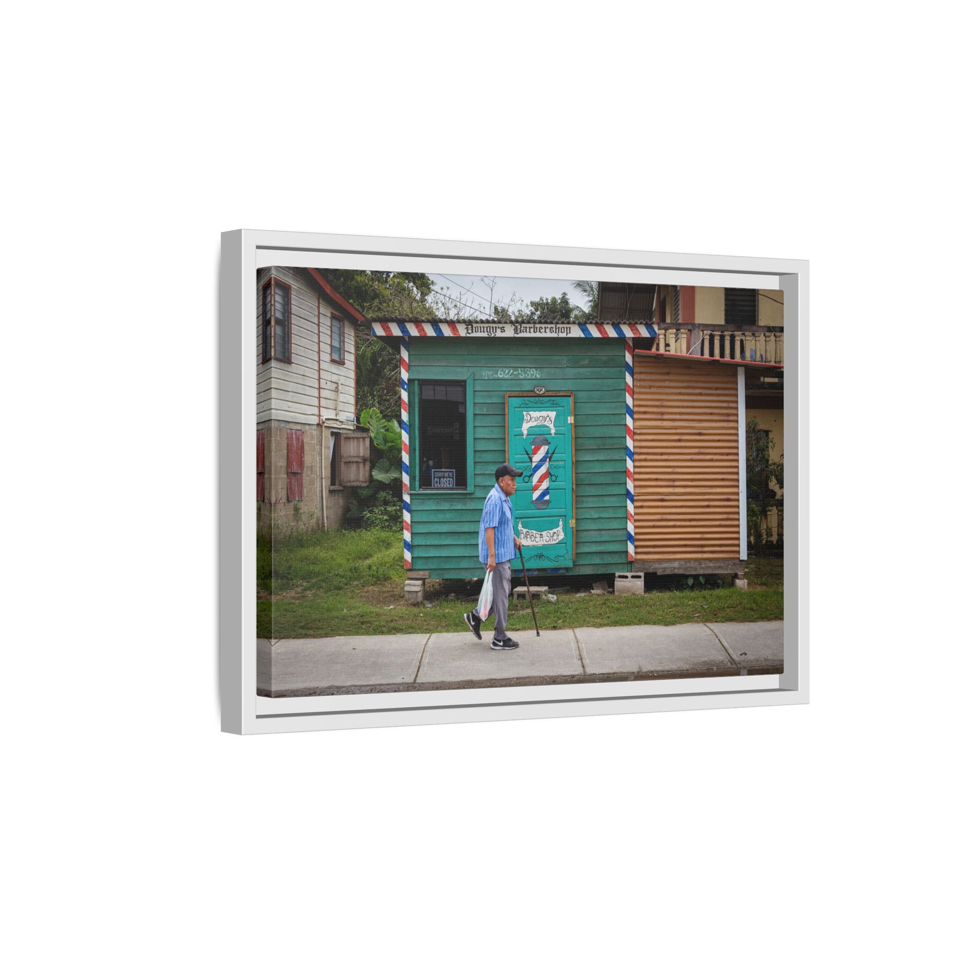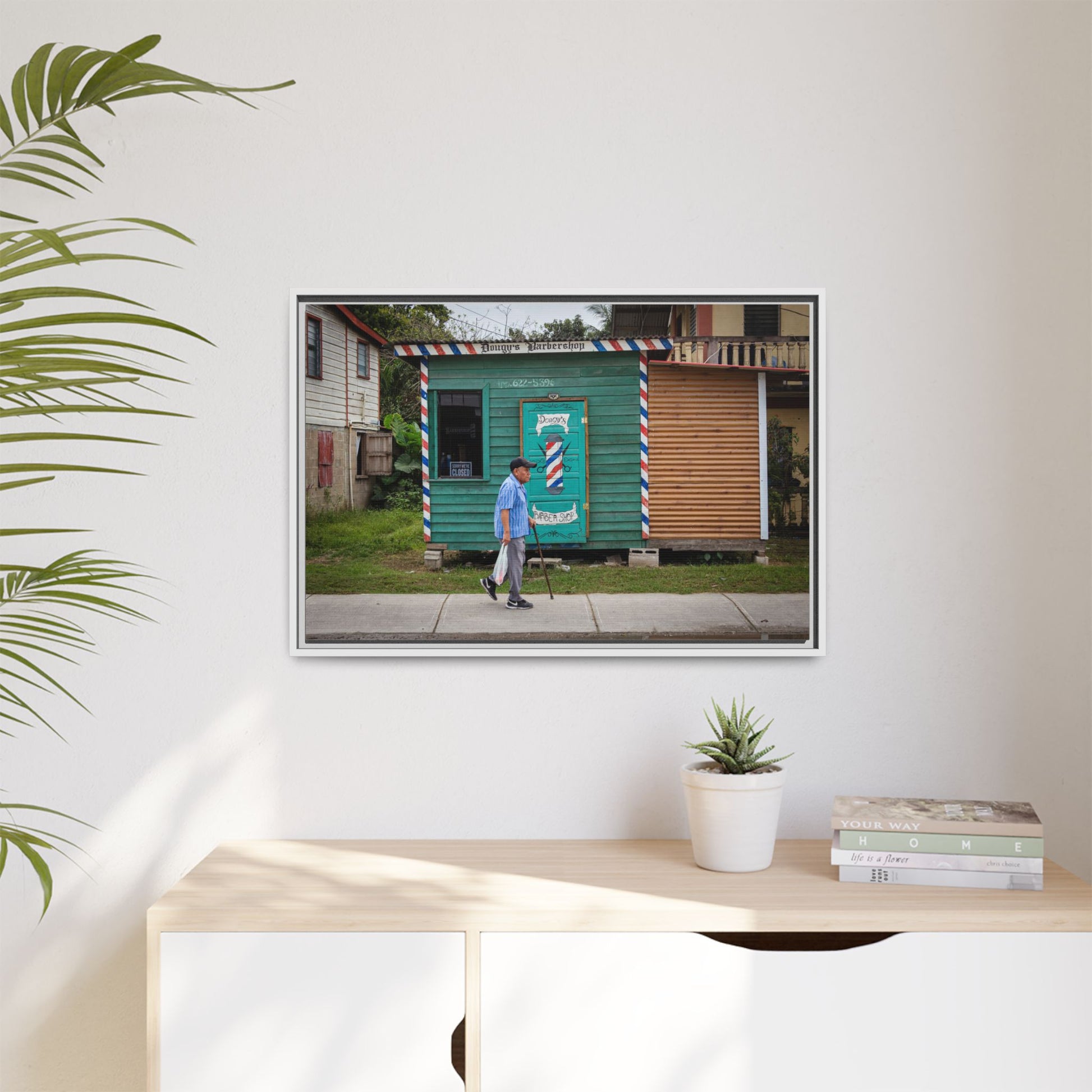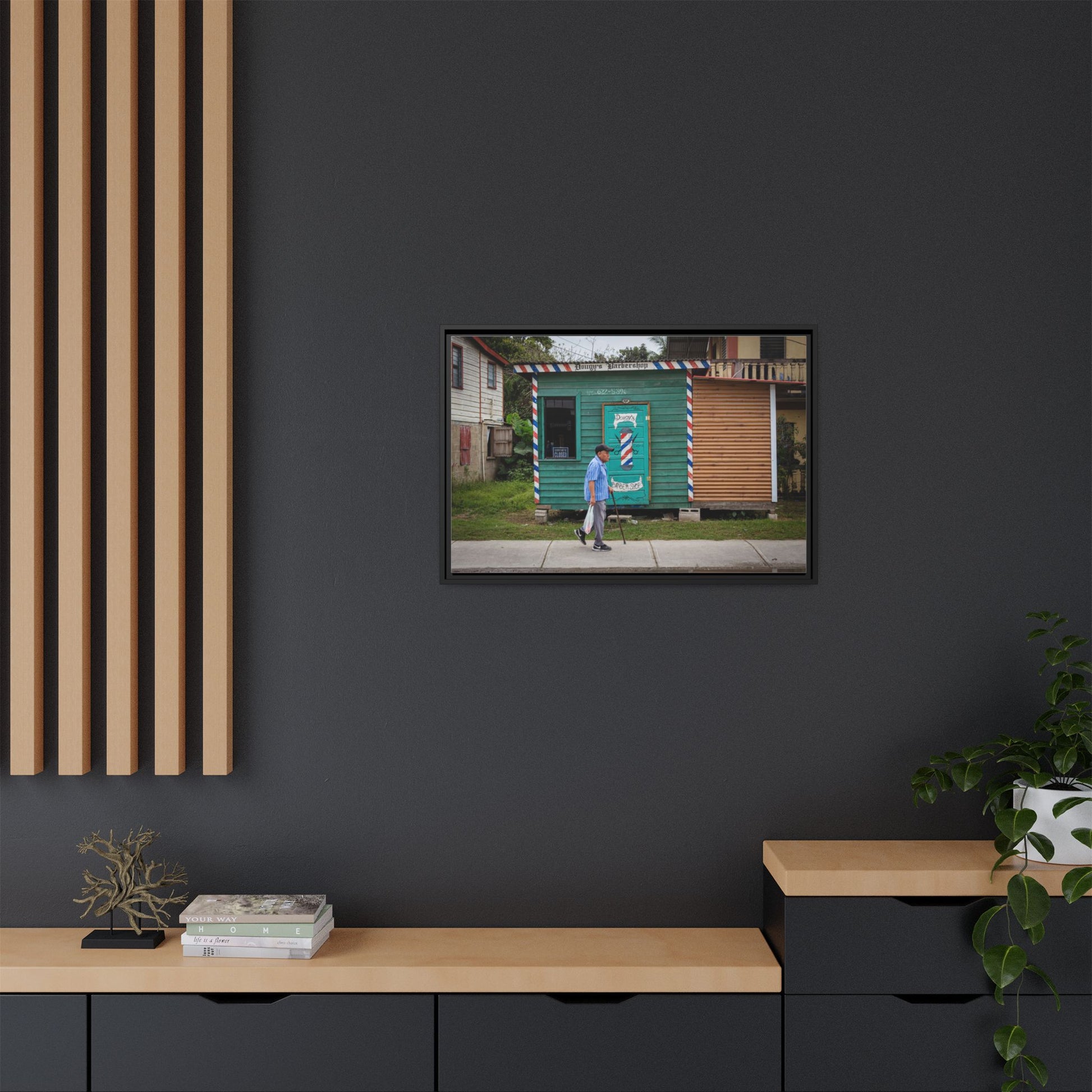 A warm, small-town street captured on matte canvas — sunlight and shade playing across the weathered storefronts of San Ignacio. The scene follows an elderly man as he ambles past a humble barbershop shack.Framed in sustainable pine, the print feels lived-in and tactile: the matte finish softens glare and invites a slow look. Hang it where you want a quiet moment of place — a hallway that remembers travel, a living room that loves texture, or a study that welcomes calm detail. The subtle multi-color palette brings out the building facades and the man’s thoughtful pace, while the framed edge gives the piece presence on the wall without shouting for attention.