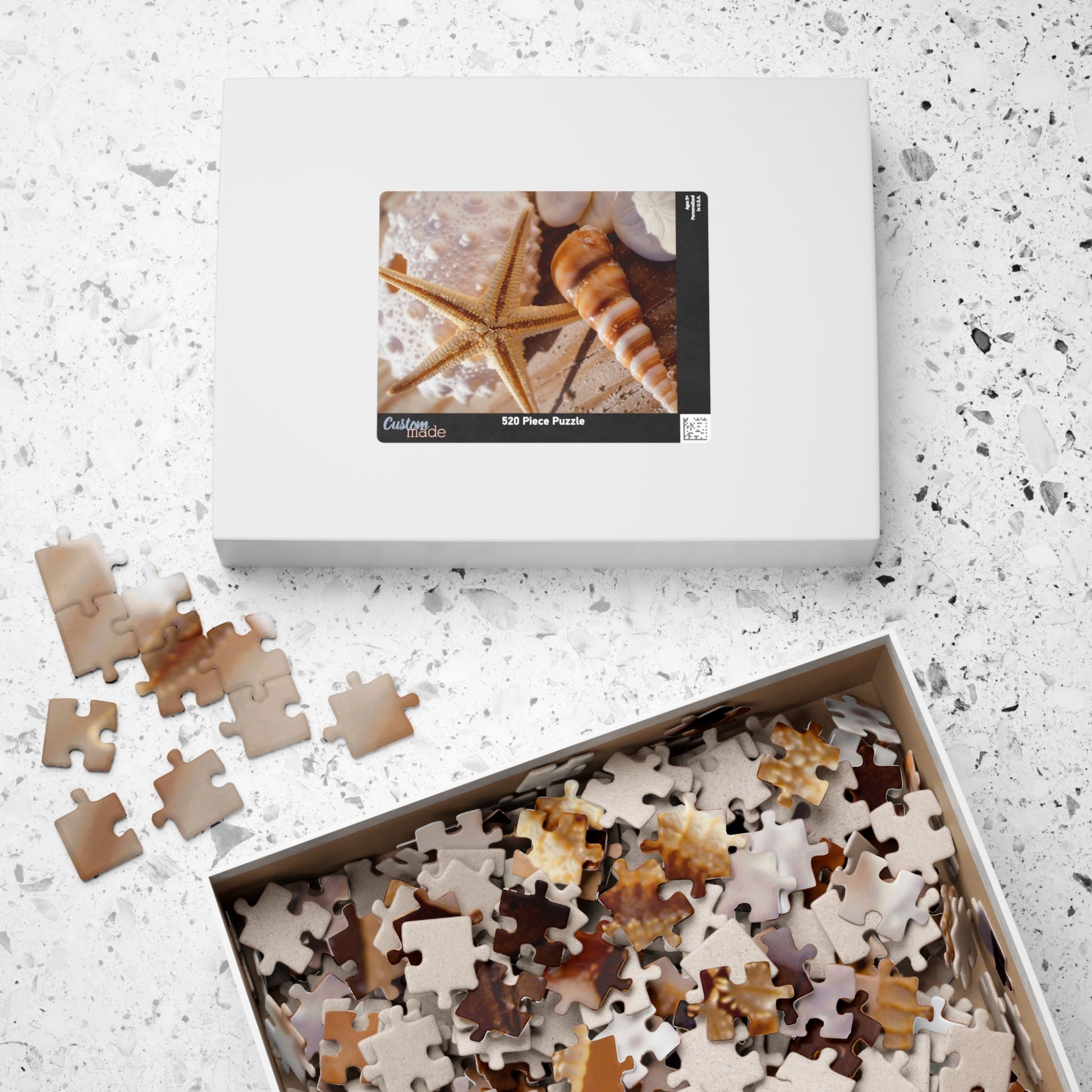Sun-warmed sand, the hush of tide pools, and the slight grit of seashells under your fingers — this chipboard puzzle brings a quiet beach afternoon to your table. Each glossy piece captures the soft, sunlit tones of starfish and spiraled shells so you can unspool the scene slowly, cup of tea in hand. It’s the kind of tactile, focused project that pulls conversation into gentle stories: childhood shore walks, collected shells in a jar, and evenings spent fitting small shapes together while the light fades. Available in several piece counts and orientations, this puzzle slips easily into a coastal-styled living room, a rainy-weekend ritual, or a relaxed gathering where you trade memories as you work the edges. The boxed artwork makes storage and gifting simple, and the sturdy chipboard pieces feel substantial as they click into place.