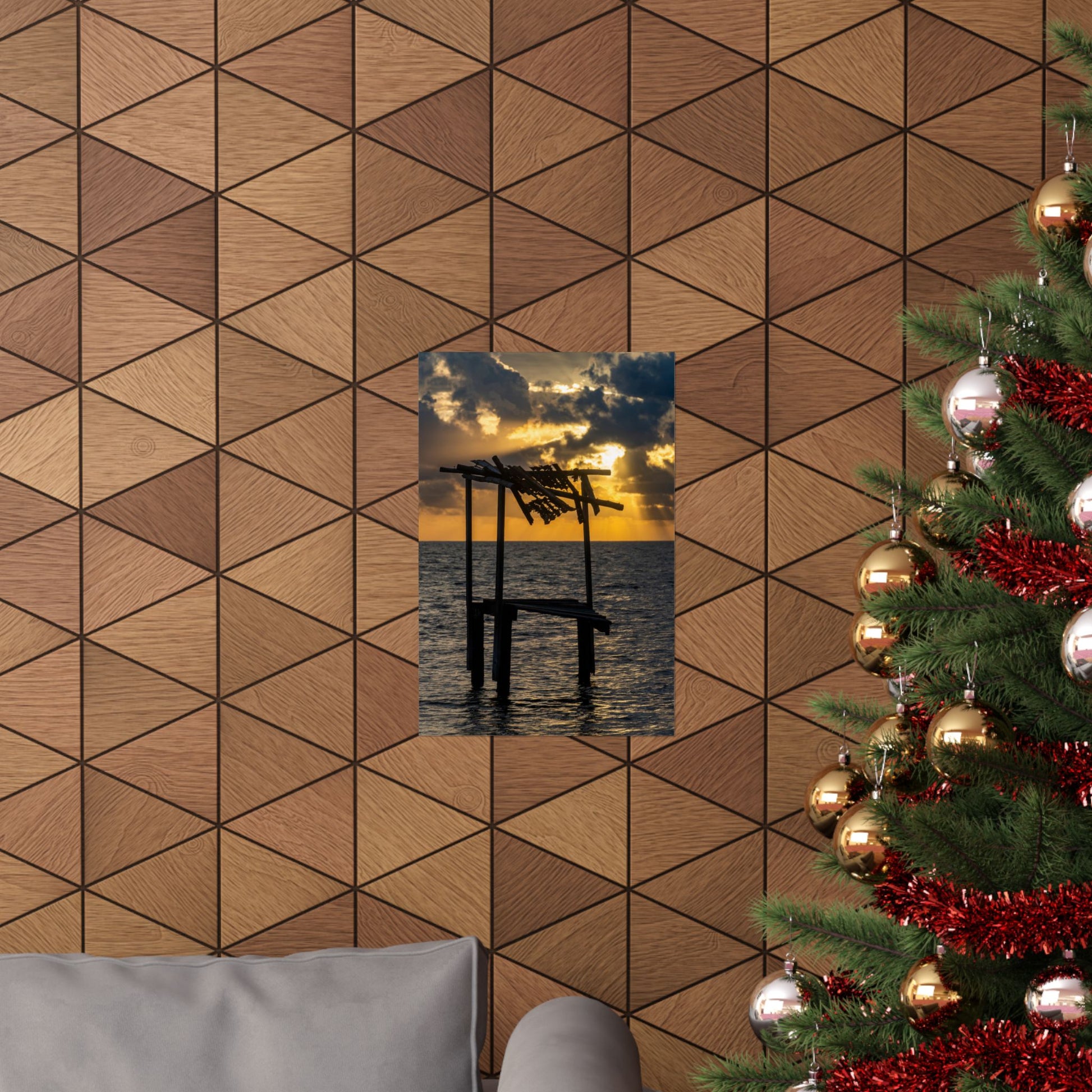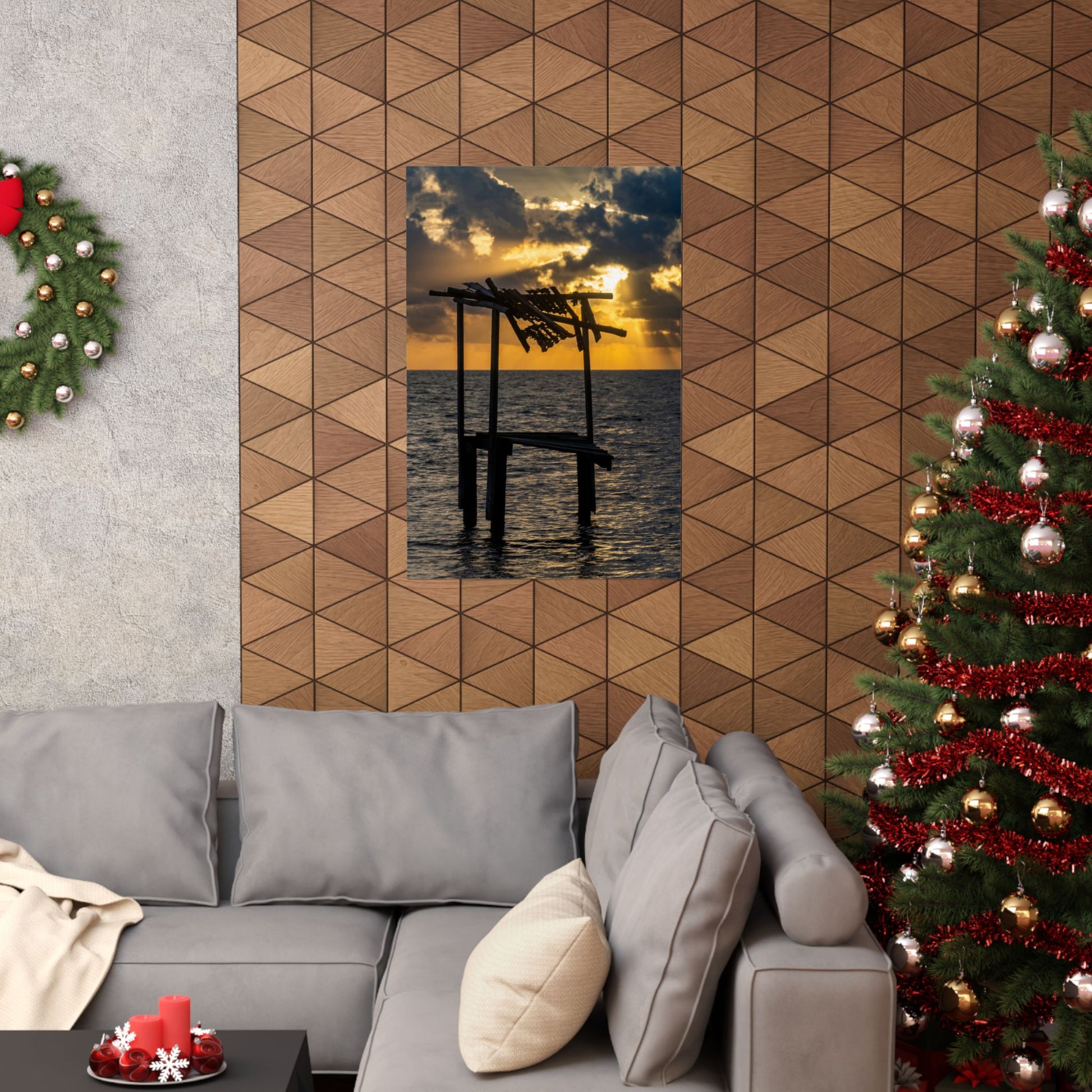 A matte vertical poster capturing a quiet coastal moment—sunlight breaking through heavy clouds to silhouette an aged wooden pier over calm water. The scene feels like a slow exhale: warm golds and deep blues balanced by crisp, museum-quality detail. Printed using giclée inks on archival museum-grade paper, colors hold their intensity and the matte finish keeps glare low, inviting you to step closer and lose yourself in the light. Hang it in a reading nook, a beach house entry, or a home office to bring a contemplative, sailor-at-dawn atmosphere that settles the mind and honors patience and memory.