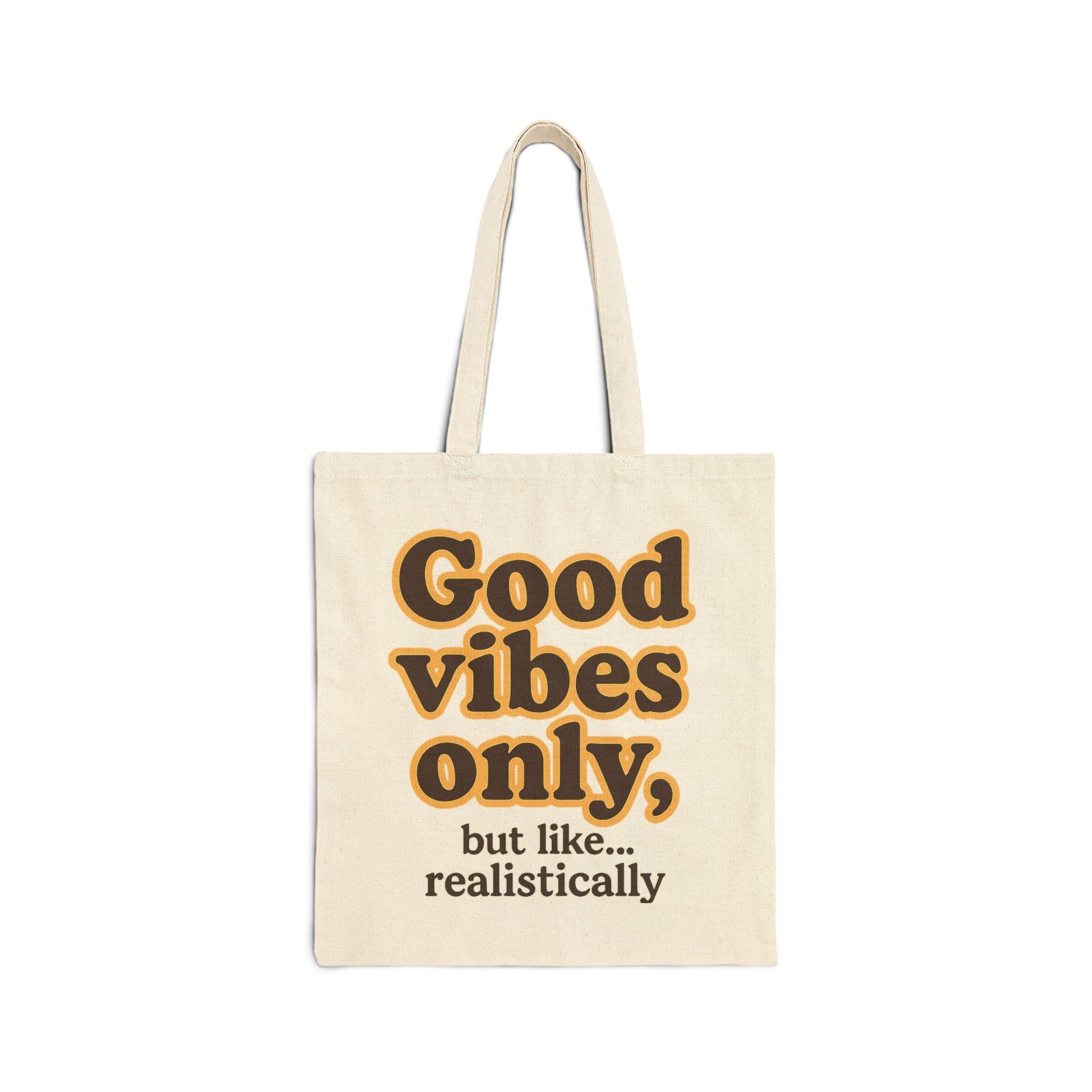 A retro 1970s type tote bag with the quote 'Good Vibes Only'. Perfect for anyone looking to add a touch of nostalgia and positivity to their daily essentials. Ideal for adults who appreciate vintage styles and want to carry a durable and practical bag. Great for everyday use, trips to the beach, shopping, or as a gift for someone who loves retro themes.