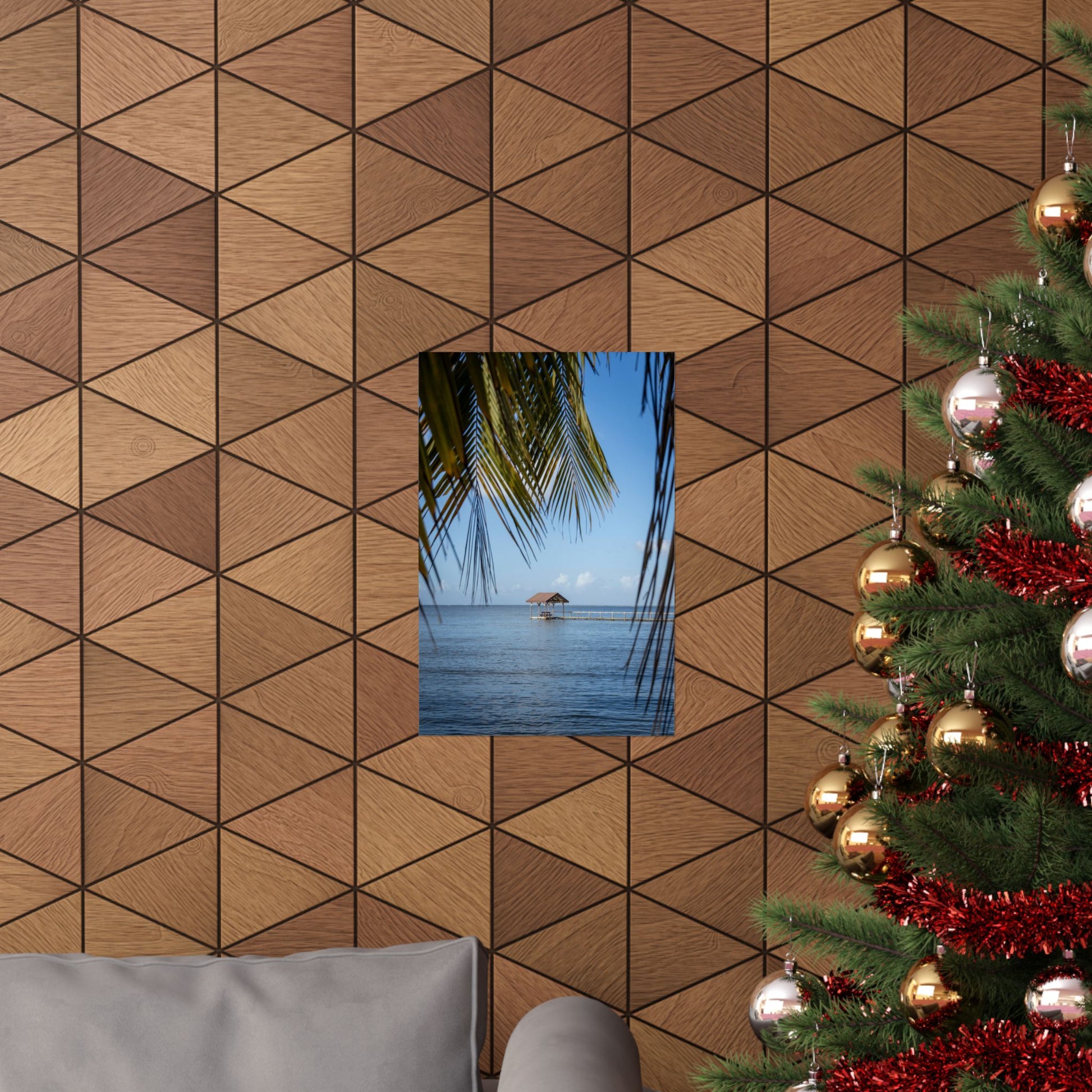 A tranquil matte poster that captures a quiet tropical moment — palm fronds framing a lone hut on stilts, blue sky meeting calm ocean. Printed with museum-grade archival paper and giclée inks, the image holds deep, luminous color without glare thanks to the soft matte finish. It brings a sense of slow afternoons, salt air, and easy breathing into interior spaces — a subtle focal point for living rooms, bedrooms, or home offices that crave a restful, travel-tinged mood.